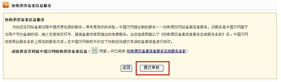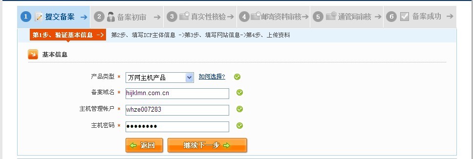 第一步,填寫并提交備案信息 1.1 驗證基本信息:請按照提示輸入信息,系統(tǒng)會驗證信息是否有效。 1.2 填寫網(wǎng)站:請按要求填寫真實的網(wǎng)站信息 點擊“繼續(xù)下一步”會出現(xiàn)提示:是否繼續(xù)增加網(wǎng)站? 2.1上傳資料 點擊“繼續(xù)下一步”彈出提示:是否確認(rèn)提交備案信息? 2.2同意協(xié)助修改協(xié)議; 點擊“提交審核”后,彈出提示信息:已成功提交萬網(wǎng)審核,客戶無法再進行修改操作。 第二步:備案初審 第三步:等待郵寄資料