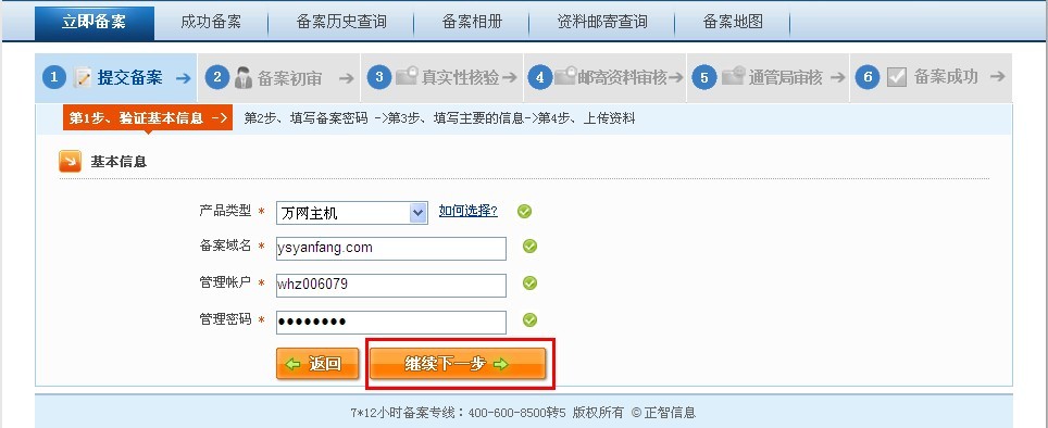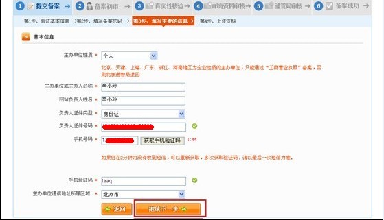 5.核對(duì)填寫的信息,點(diǎn)擊“繼續(xù)下一步” 6.同意萬(wàn)網(wǎng)協(xié)助修改信息協(xié)議;