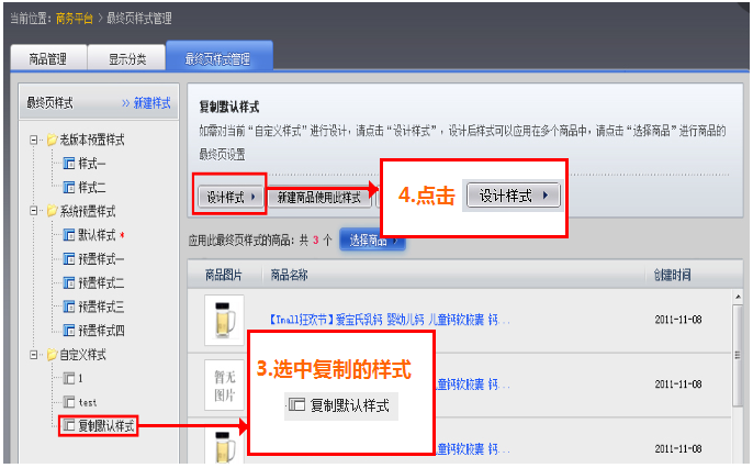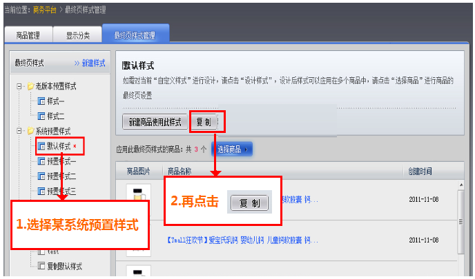 您可以在“商務(wù)平臺->商品->最終頁樣式管理 頁”中,可以看到最終頁樣式分為三種類型,老版本預(yù)置樣式、系統(tǒng)預(yù)置樣式和自定義樣式。 (1)老版本預(yù)置樣式不能設(shè)計(jì),只能選擇商品應(yīng)用此樣式; (2)系統(tǒng)預(yù)置樣式也不能設(shè)計(jì),但是可以將此樣式先復(fù)制到自定義樣式中